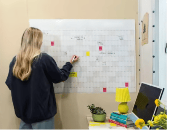 ย Fine-point dry-eraseย markers that write directly on the calendar andthe custom labels